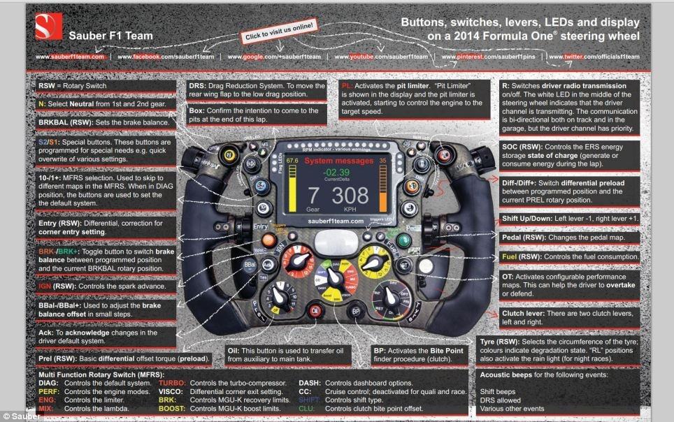The controls on a formula 1 steering wheel tune a lot of the running parameters for the engine, transmission, differential, and more. Knowing it costs around 90 000 euros, . The steering wheel of a modern formula 1 race car is more complex than even the most complicated video game controller and the driver not . A driver can push this button when entering the pit lane to ensure that he doesn't get . There are also the rotaries on the steering wheel, which control differential adjustments.